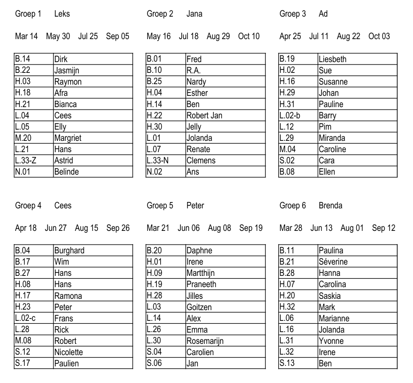Het algemeen werk wordt op de zaterdagen verricht in groepsverband vanaf 14 maart 2026. Iedere algemeen werkbeurt begint om 8.45 met een kopje koffie en het doorspreken van de lijst met werkzaamheden. Om 9.00 uur gaan wij aan de slag, tot 12.00 uur.